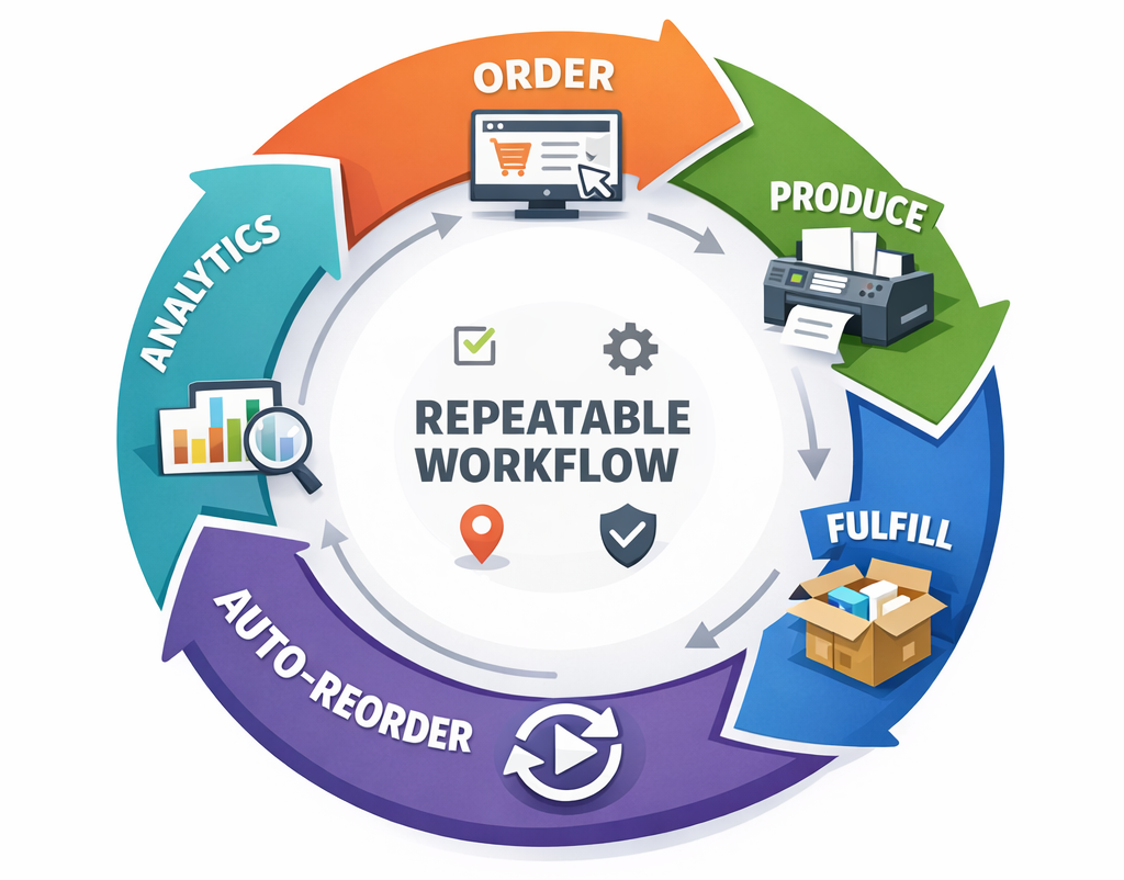 Tech and integration is the “system layer” that makes print harder to replace and easier to keep buying. When a customer orders through an integrated eStore or Print on Demand workflow, you’re no longer just fulfilling a job – you’re helping them control a process: approved templates, correct specs, role-based access, location-level versioning, and a repeatable reorder path. That reduces errors, cuts back-and-forth, and keeps brand and compliance standards consistent across teams and locations.